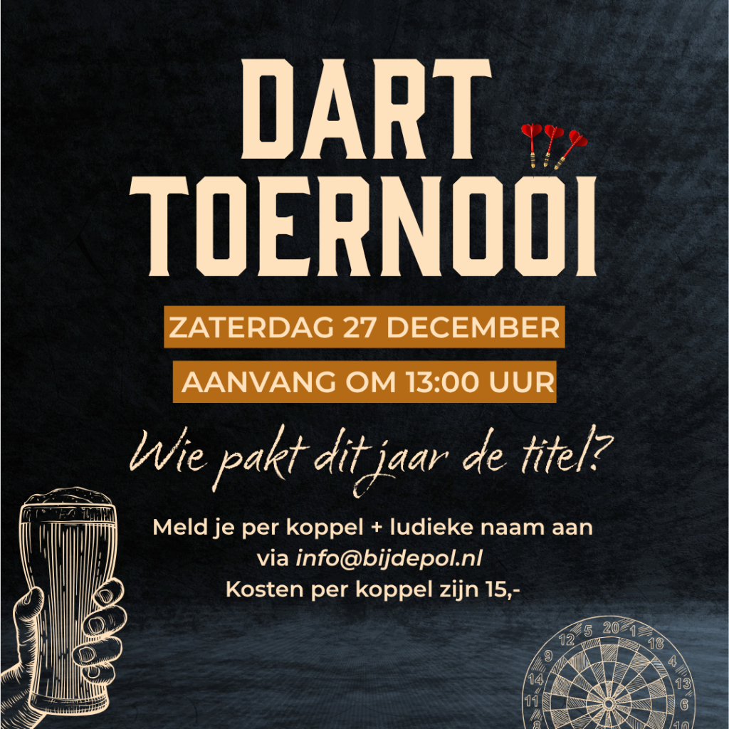 Dus zoek je dartmaatje, bedenk een creatieve teamnaam en meld je snel aan via info@bijdepol.nl